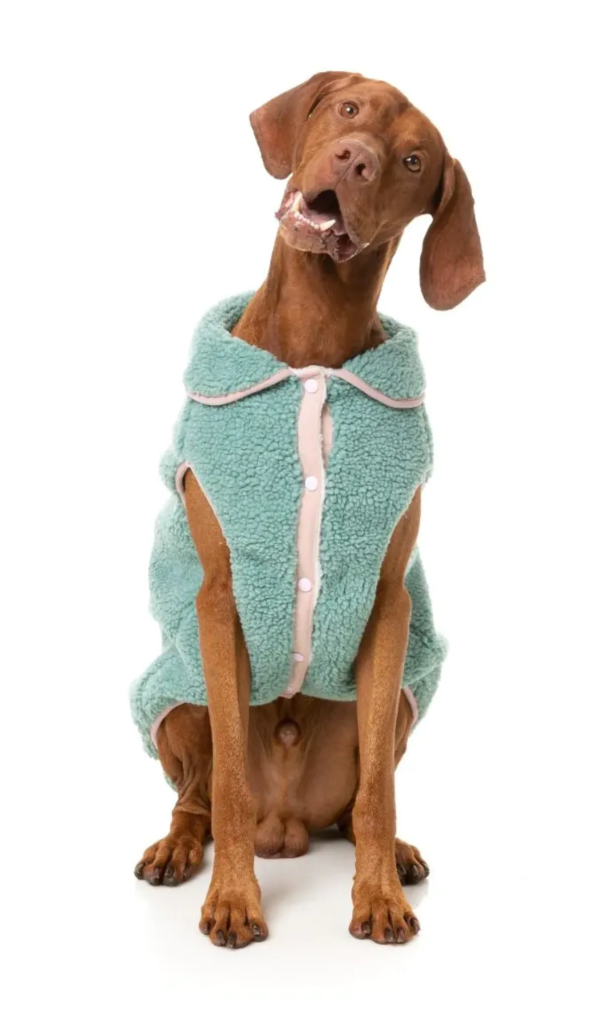 The front chest snap buttons are excellent for easy closure and wearability, and an added harness hole means they can easily wear their harness underneath.