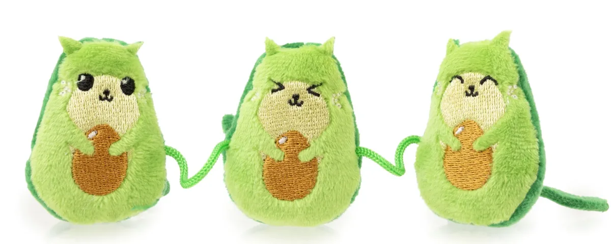 Bring out your cat’s playful side with our Avocatos plush cat toys. This trio of plush creatures attached by a string will keep all of those cool cats and kittens entertained for hours. The crinkle sounds will instantly spark curiosity and the premium catnip will keep your cat coming back for more.