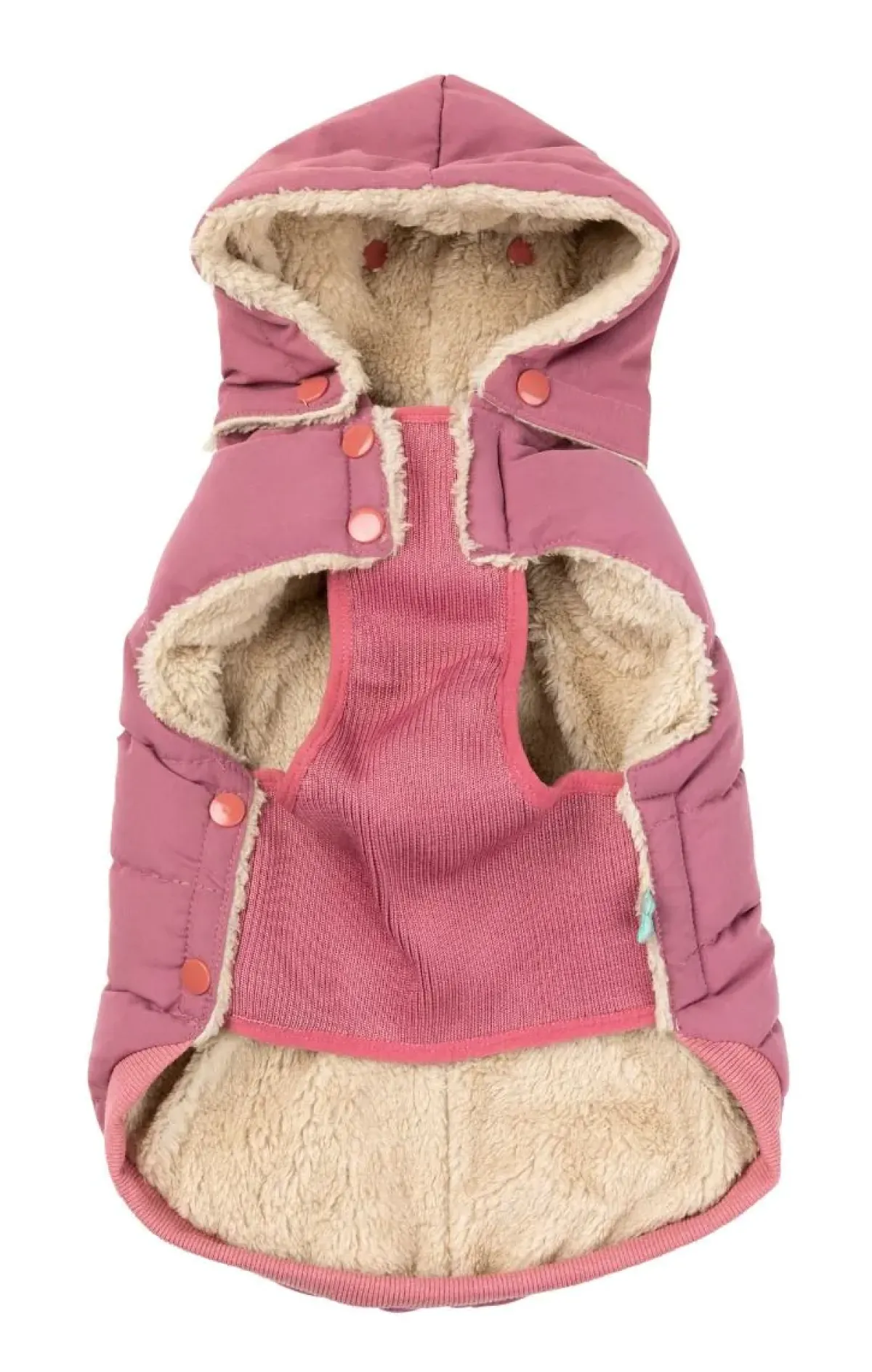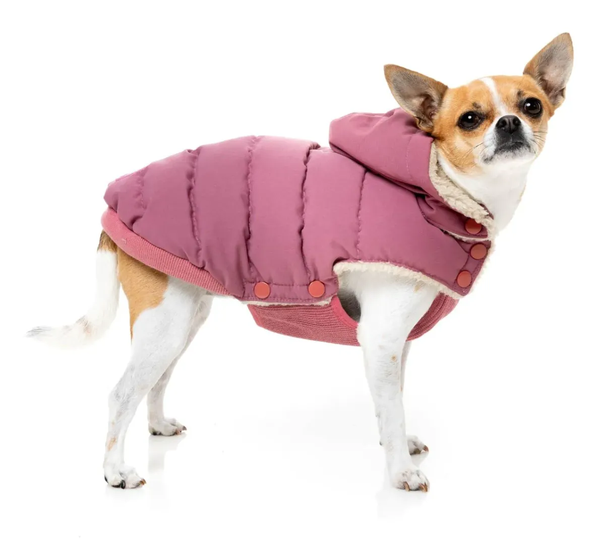 The neck and chest snap buttons are excellent for easy closure and wearability. Have your pet step into the leg hole and wrap the jacket around their back, attaching the neck and chest on the other side.