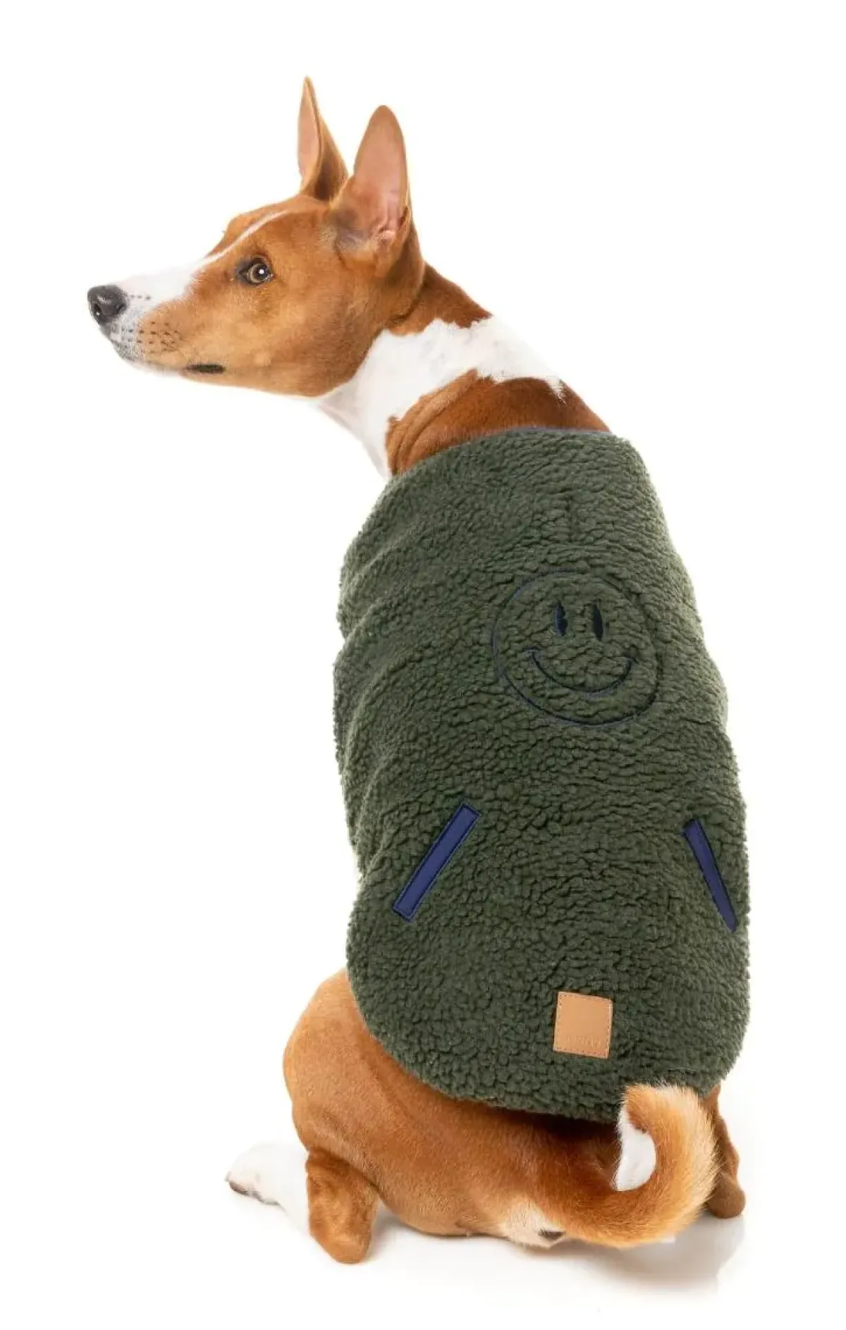 Side 1 is made from a thick sherpa material and includes an embroidered smiley face in a contrasting color. Faux pockets add extra style to this piece. This side is perfect for those rugged vibes.