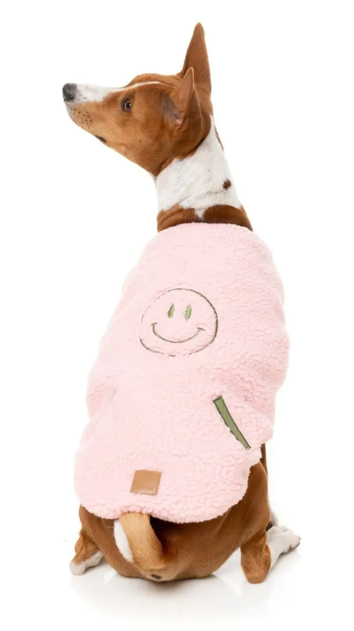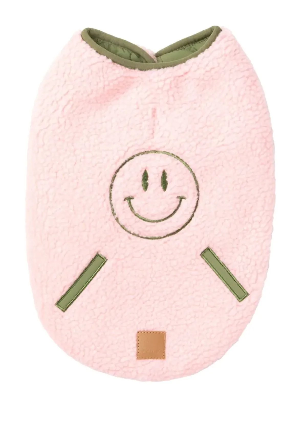 Side 1 is made from a thick sherpa material and includes an embroidered smiley face in a contrasting color. Faux pockets add extra style to this piece. This side is perfect for those rugged vibes.