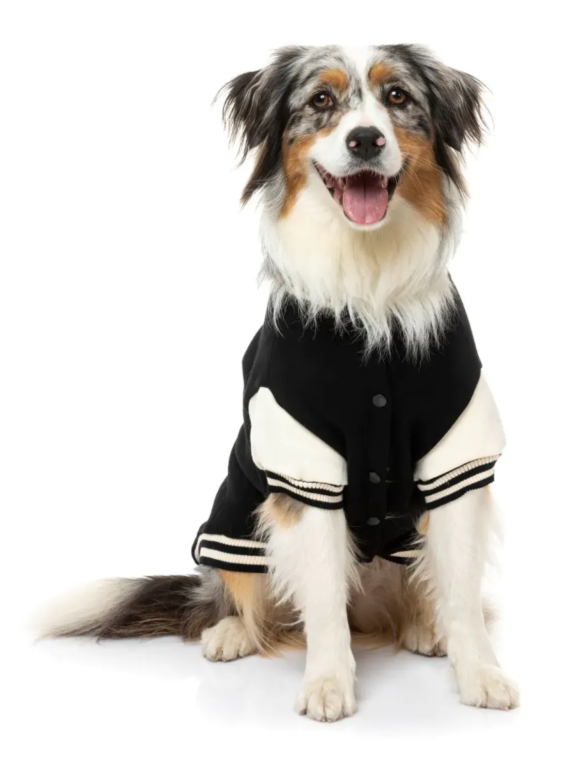 This retro-style varsity jacket is made from a super soft and warm material with snap buttons on the chest. It features a red FuzzYard chenille patch, contrast sleeves with striped ribbed trims, collar and faux pockets. Your pup will be the most popular pooch at the dog park and will be the envy of the pack in the FuzzYard Letterman Jacket.